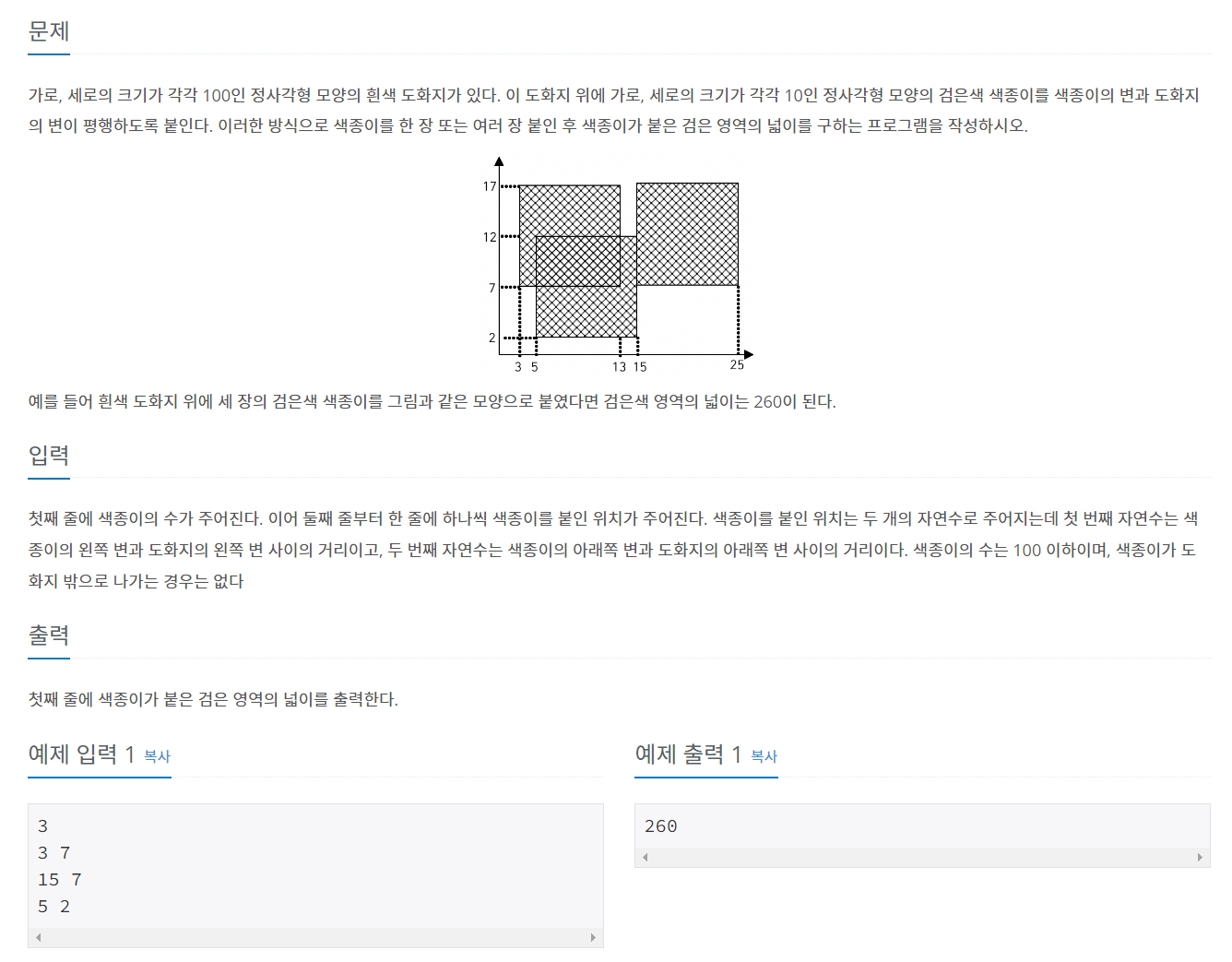 이러한 방식으로 색종이를 한 장 또는 여러 장 붙인 후 색종이가 붙은 검은 영역의 넓이를 구하는 프로그램을 작성하시오.